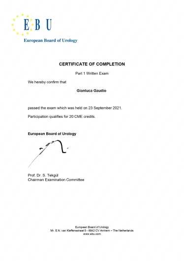 Il Dottore Gianluca Gaudio si è laureato in Medicina e Chirurgia presso l'Università degli Studi di Roma "Tor Vergata" e ha conseguito la specializzazione in Urologia presso l'Università degli Studi di Perugia con il massimo dei voti e la lode. È iscritto all'albo Provinciale dei Medici Chirurghi di Palermo. Ha acquisito esperienza lavorativa clinica e chirurgica presso diversi ospedali del centro-nord Italia ed ha recentemente svolto servizio presso la Fondazione Istituto G. Giglio di Cefalù (Ospedale Giglio di Cefalù). Attualmente è in servizio presso la U.O. di Urologia dell'ASP di Palermo (Ospedale Civico di Partinico). Partecipa frequentemente come relatore a numerosi congressi nazionali ed internazionali e svolge attività scientifica come autore e revisore per diverse riviste scientifiche internazionali. Ha inoltre conseguito il titolo di Dottore di Ricerca in Medicina Clinica e Molecolare presso l'Università di Perugia.